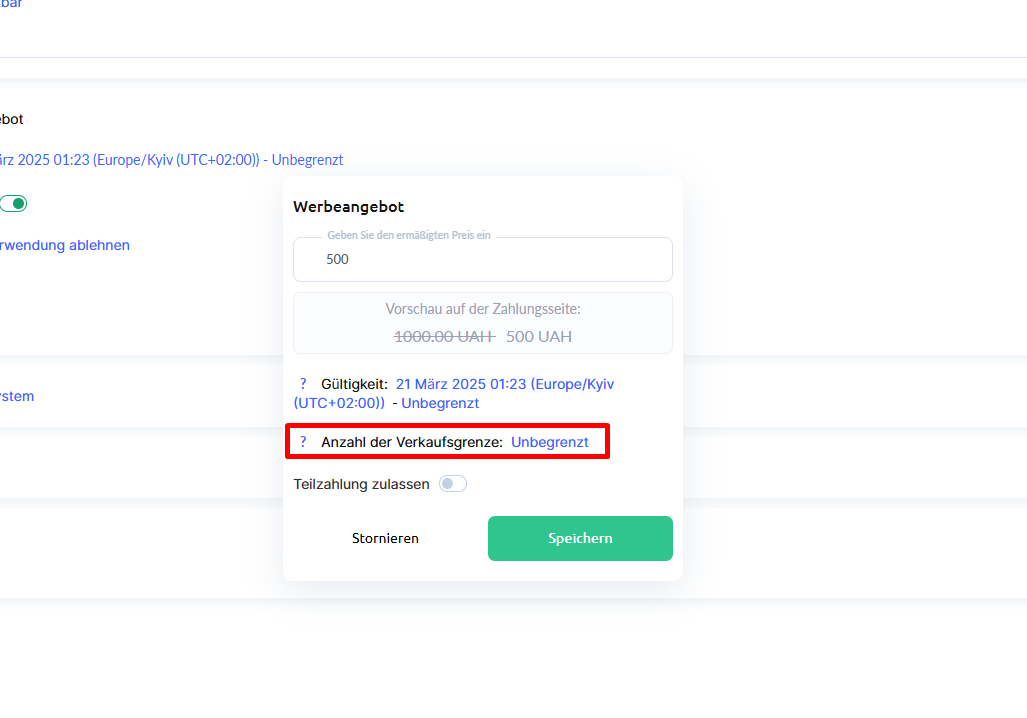 Sie können außerdem die Anzahl der Käufe zum Aktionspreis begrenzen (z. B. 10 Verkäufe). Wenn kein Limit erforderlich ist, lassen Sie das Feld leer oder geben Sie 0 ein.