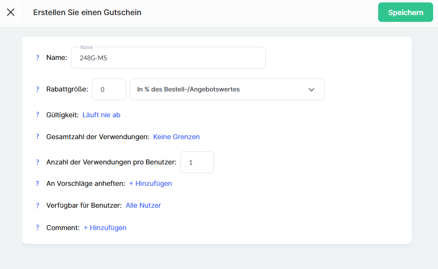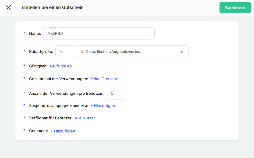 Kommentar – eine interne Notiz zum Gutschein, die nur für Administratoren sichtbar ist. Kommentare ermöglichen es dir, interne Anmerkungen zu jedem Gutschein hinzuzufügen, um dich an den Zweck seiner Erstellung zu erinnern, Details einer Marketingkampagne festzuhalten, die Kommunikation im Team zu erleichtern oder den Überblick bei einer großen Anzahl von Gutscheinen zu behalten. Kommentare sind ausschließlich für Administratoren sichtbar und werden den Kunden nicht angezeigt.