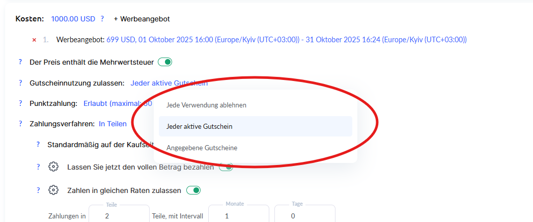Beim Bearbeiten eines Gutscheins können alle Einstellungen geändert werden – außer in Fällen, in denen der Gutschein bereits verwendet wurde. In diesem Fall können einige Parameter gesperrt sein, um die Integrität der Transaktionsdaten zu gewährleisten.