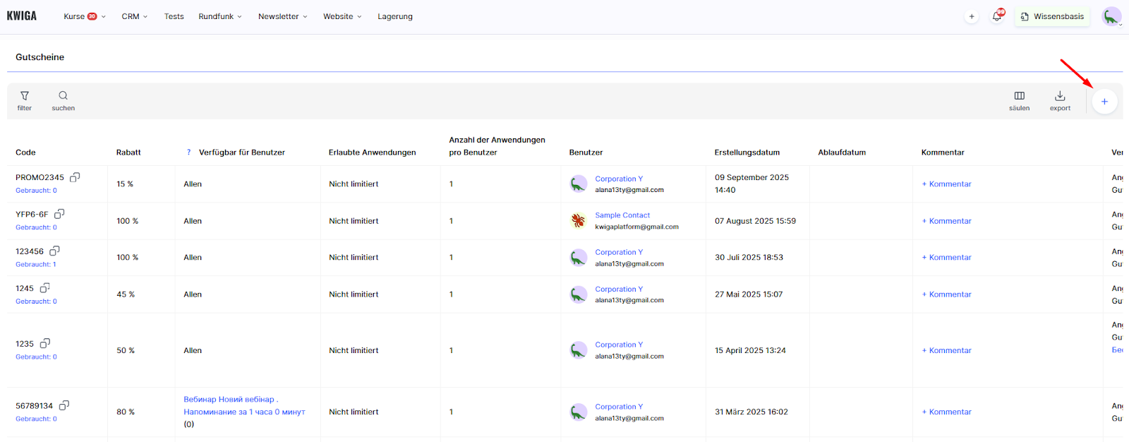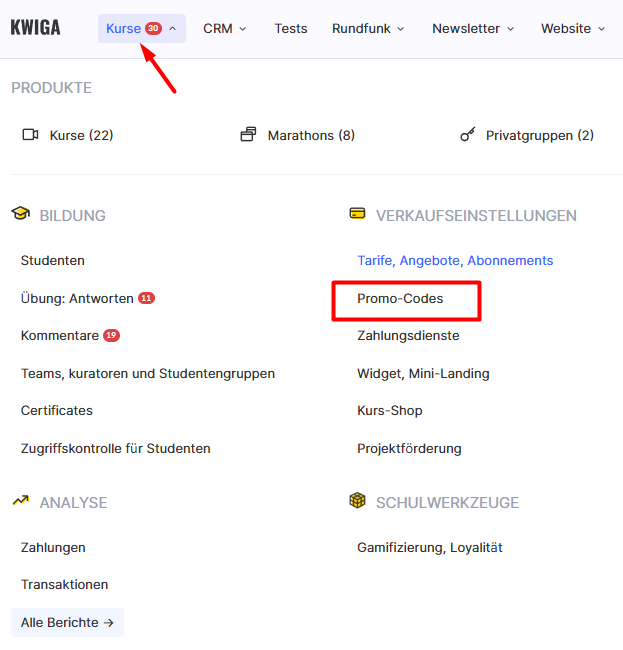 Um bereits erstellte Gutscheine anzuzeigen oder neue hinzuzufügen, gehen Sie zu Kurse → Promo-Codes.