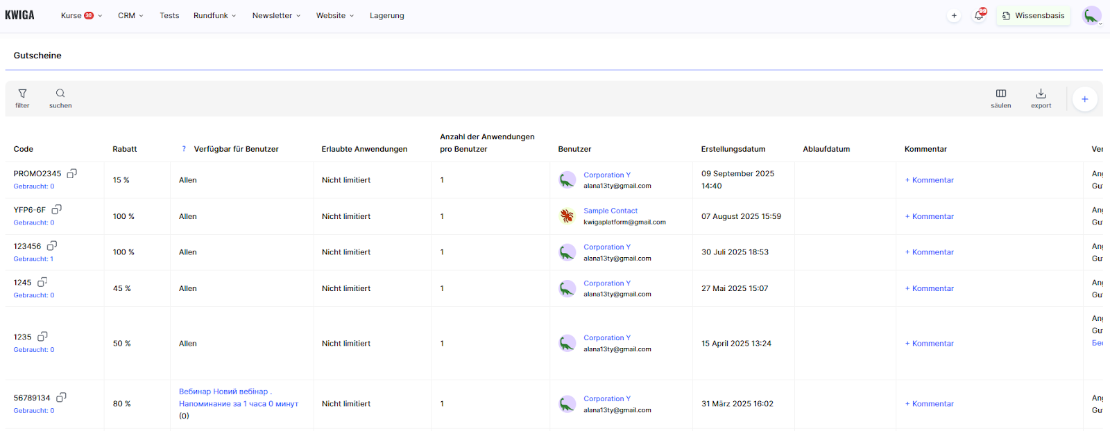 Der Abschnitt Gutscheine zeigt alle erstellten Gutscheine mit ihren wichtigsten Informationen. Hier können Sie verfügbare Rabatte, Nutzungsbedingungen und den Status jedes Gutscheins schnell überprüfen.