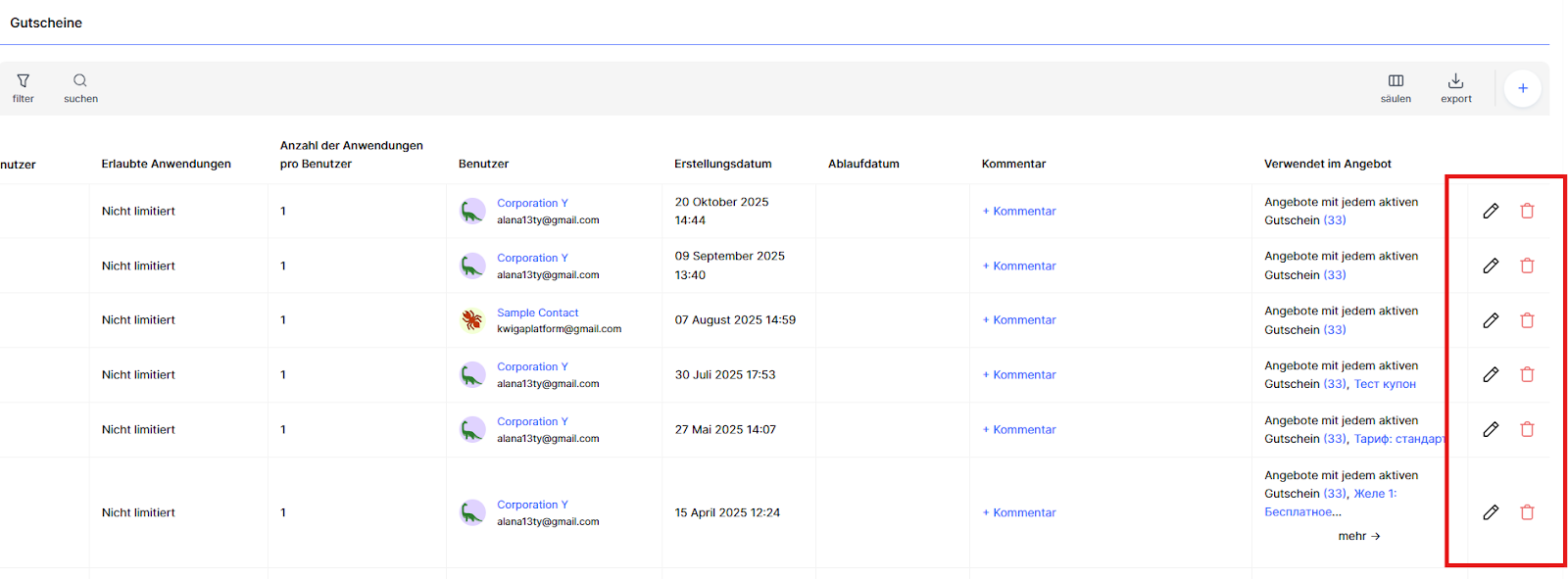 In der Gutscheinliste kannst du Gutscheine über die entsprechenden Schaltflächen bearbeiten oder löschen. So kannst du schnell Änderungen vornehmen oder unnötige Codes entfernen.