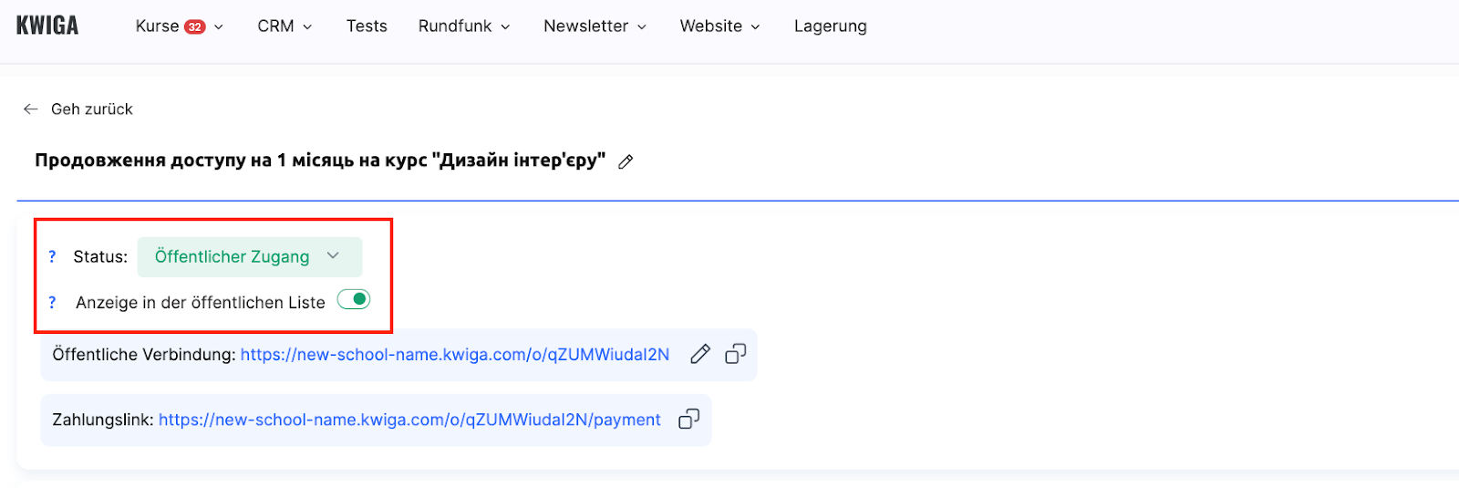 Ändern Sie den Status auf Veröffentlicht und aktivieren Sie – falls Sie möchten, dass Teilnehmer, die den Zugriff auf den Kurs bereits verloren haben, zur Kursseite gehen und dieses Angebot in der Liste sehen, wenn sie auf die Schaltfläche Zugriff erhalten klicken – den Schalter „In öffentlicher Liste anzeigen“. Wenn Sie die Zugriffserweiterung ausschließlich über einen Link verkaufen möchten, aktivieren Sie diesen Schalter nicht, ändern Sie den Status jedoch auf Öffentlich.