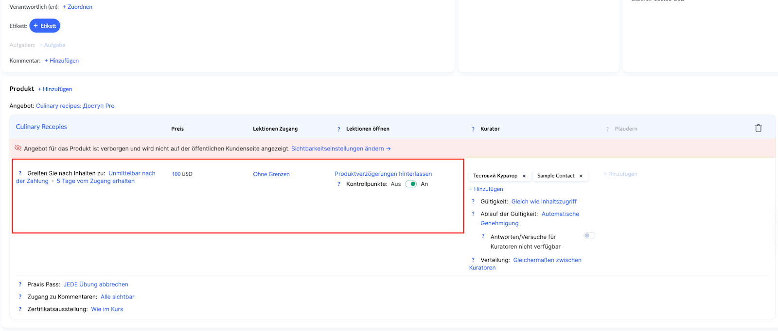 Zum Beispiel können Sie die Anzahl der Lektionen anpassen, auf die der Teilnehmer Zugriff hat, einen anderen Zeitplan für die Freigabe der Lektionen festlegen oder Verzögerungen vollständig entfernen, sodass alle Lektionen sofort verfügbar sind. Sie können auch die Methode zur Überprüfung der Praxisaufgaben ändern oder Kontrollpunkte deaktivieren (den Schalter auf Rot stellen), je nach Bedarf. Klicken Sie anschließend auf Speichern.