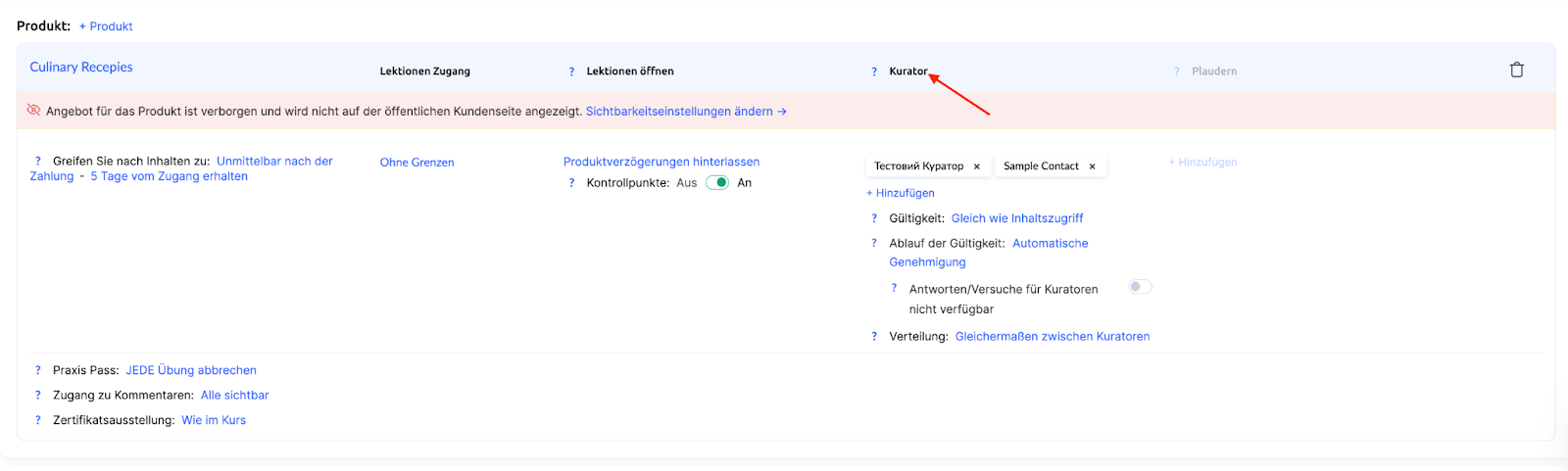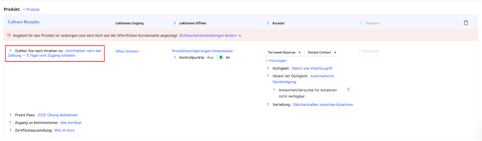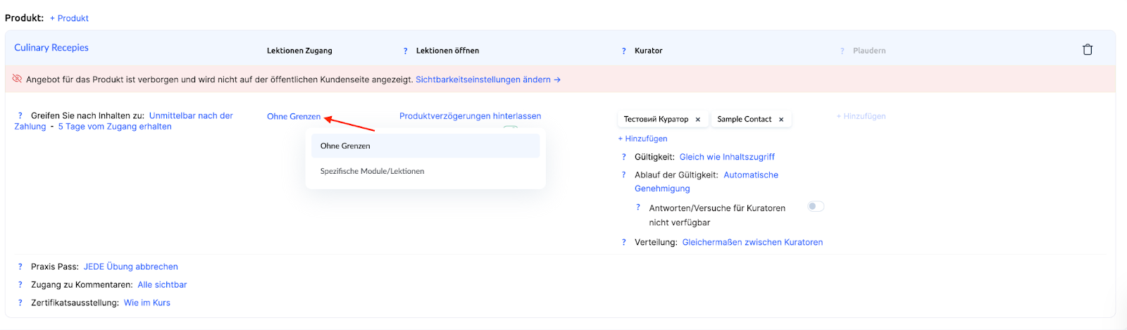 Die wichtigste Einstellung in einem Angebot ist das Hinzufügen eines Produkts. Klicken Sie auf +Produkt und wählen Sie den gewünschten Kurs aus. Anschließend sehen Sie Optionen, die konfiguriert werden können: