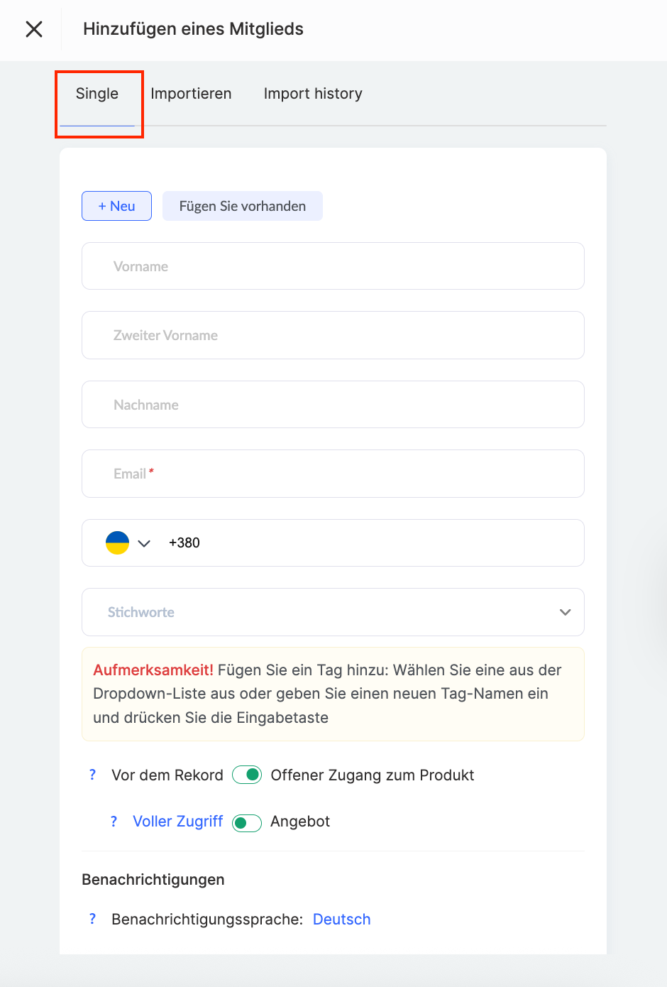 Zusätzlich zum Import einer Liste können Sie Teilnehmende auch einzeln hinzufügen. Öffnen Sie dazu den Tab Teilnehmende, klicken Sie auf + und wählen Sie Mitglied hinzufügen. Geben Sie anschließend die E-Mail-Adresse und den Namen ein und wählen Sie das Angebot aus, um Zugriff zu gewähren.