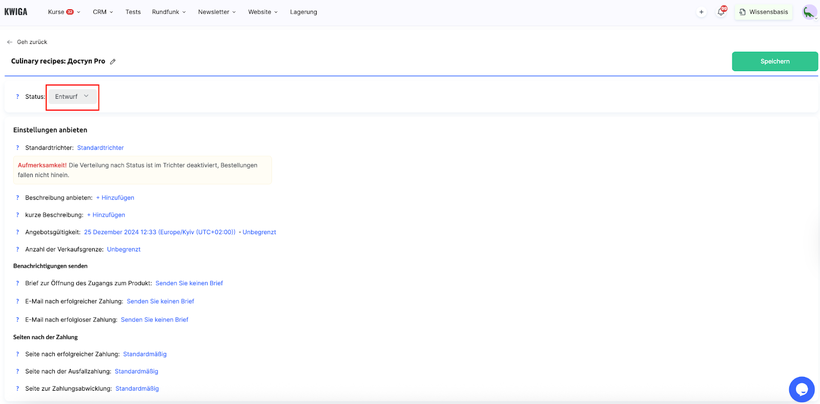 Lassen Sie den Status auf Entwurf, da dieser Artikel beschreibt, wie Zugriff ohne Verkauf über Kwiga gewährt wird. Die übrigen allgemeinen Einstellungen, einschließlich der Seite nach der Zahlung, können unverändert bleiben.