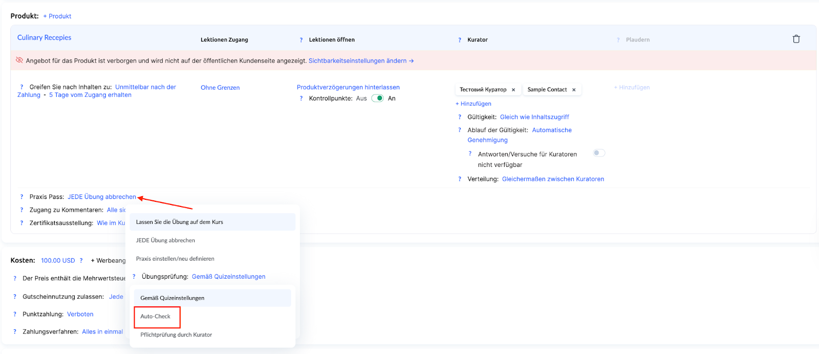 Abschluss praktischer Aufgaben: Hier legen Sie fest, wie Aufgaben überprüft werden. Wenn Sie einen Plan erstellen, der keine Überprüfung durch einen Kurator oder den Kursautor vorsieht, der Kurs jedoch offene Fragen und Aufgaben enthält, können Sie die „Automatische Überprüfung“ aktivieren. Sobald Studierende ihre Antworten einreichen, werden diese automatisch akzeptiert.