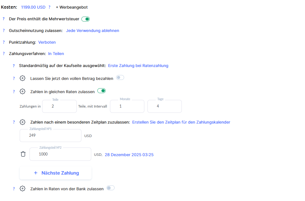 Zusätzlich ist im Beispiel die vollständige Zahlung von 1199 erlaubt. Sie können die sofortige Zahlung des Gesamtbetrags zulassen und einen höheren Gesamtbetrag angeben, z. B. 249 + 1000, um diejenigen zu motivieren, die lieber direkt alles bezahlen.