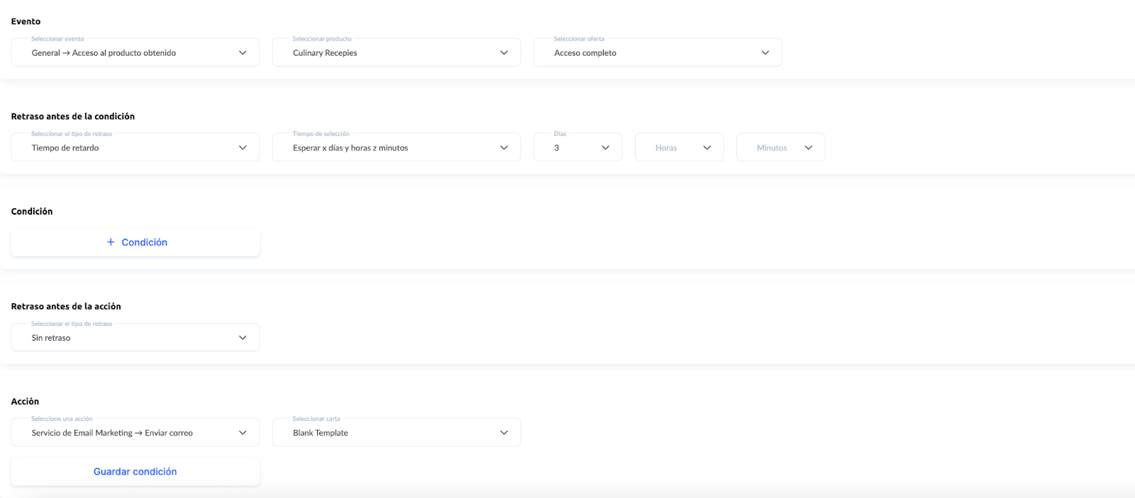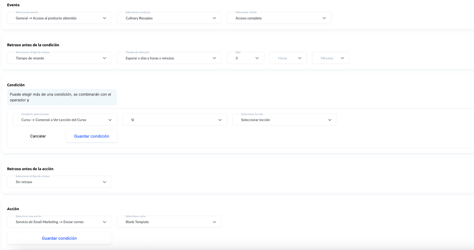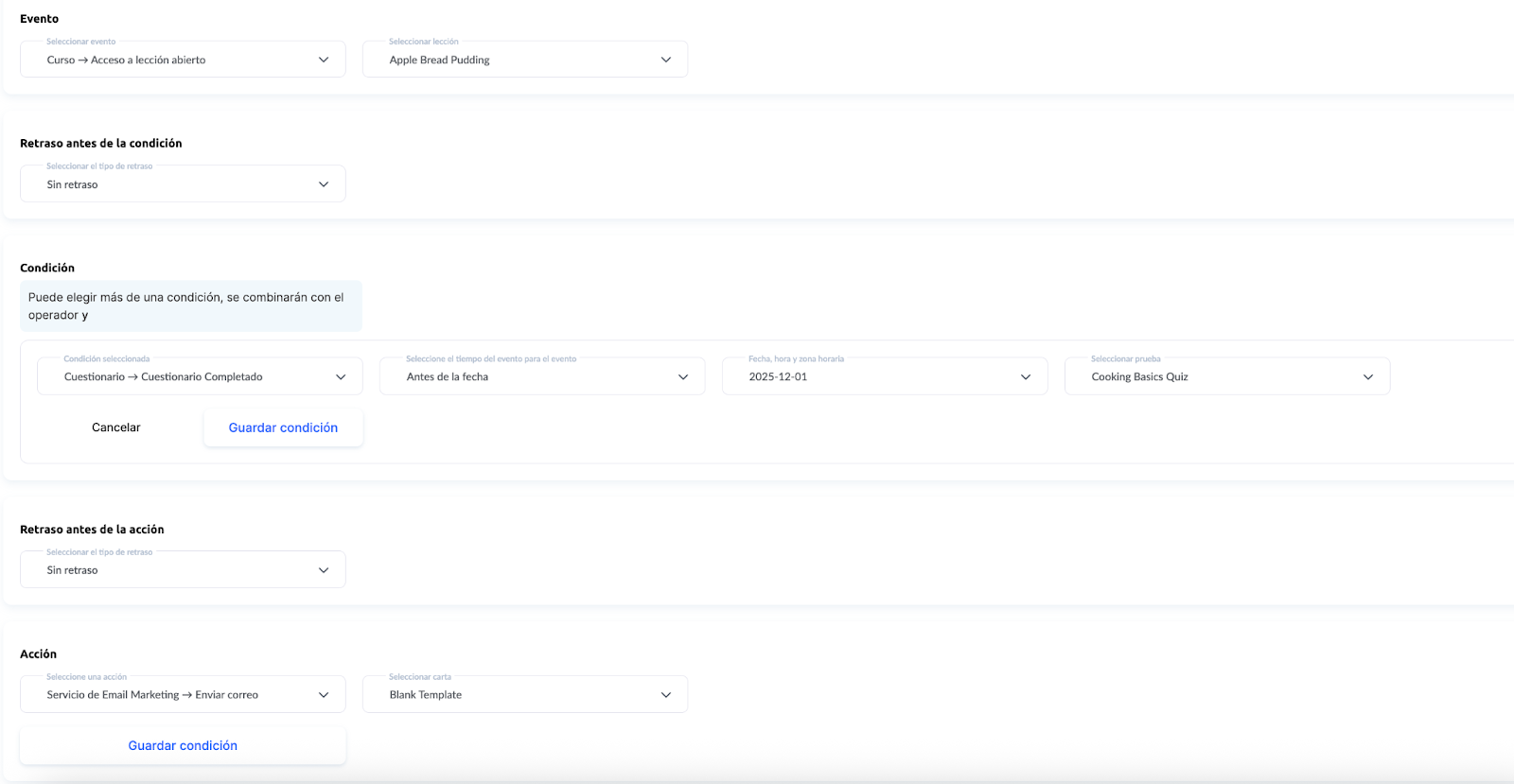 En la sección de acciones, configura el envío de un recordatorio por correo electrónico al estudiante. Si utilizas un chatbot, también puedes configurarlo para que envíe un recordatorio en los mensajeros sobre el curso.