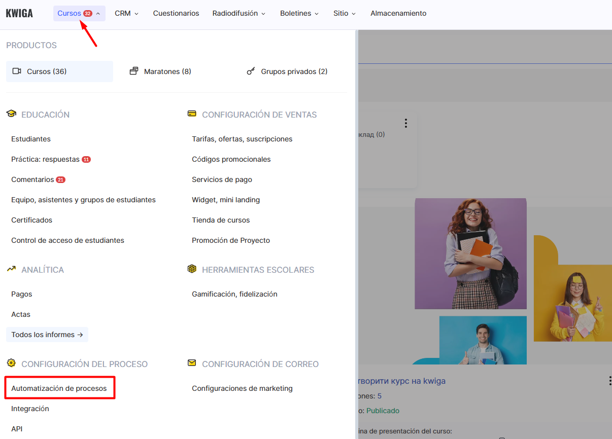 Las automatizaciones te permiten enviar plantillas de correo electrónico para eventos específicos, incluida la configuración de recordatorios que notificarán automáticamente a los estudiantes sobre el curso o acciones importantes.