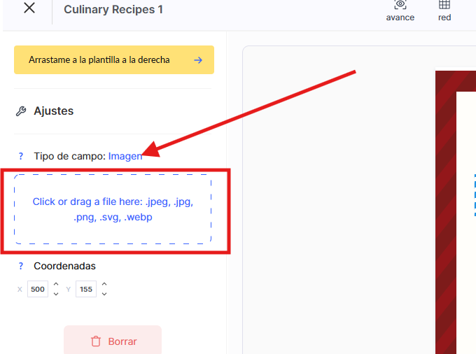 Tamaño de la plantilla — especifica las dimensiones deseadas de la plantilla en píxeles. Esto es importante para la correcta visualización y descarga del certificado.