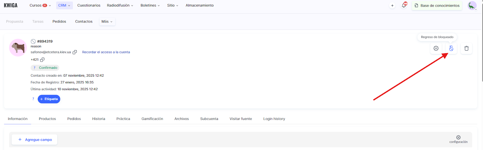 En la ficha de contacto verás una nota indicando que el usuario ha sido bloqueado, así como un botón para desbloquearlo.