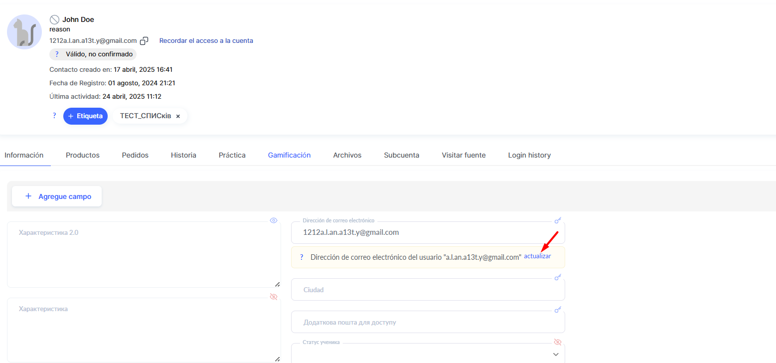Comprueba si hay un mensaje en la tarjeta de contacto indicando que el correo del usuario es diferente (ver captura de pantalla).