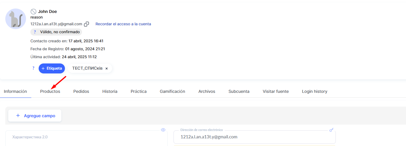 Paso 3: Ve a la pestaña Productos en la tarjeta de contacto.