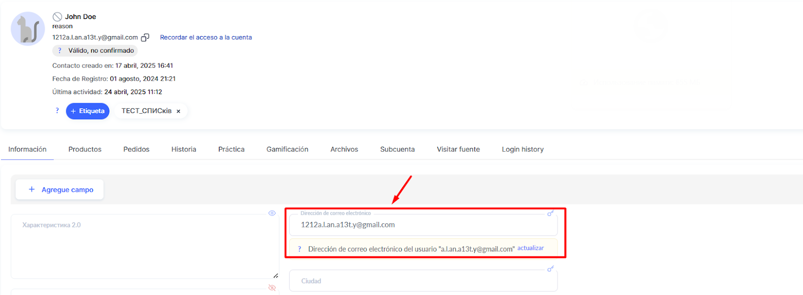 Ten en cuenta que cambiar el correo electrónico en la tarjeta de contacto del cliente no cambia el inicio de sesión del cliente. Estas acciones solo actualizan la dirección utilizada para recibir notificaciones.
