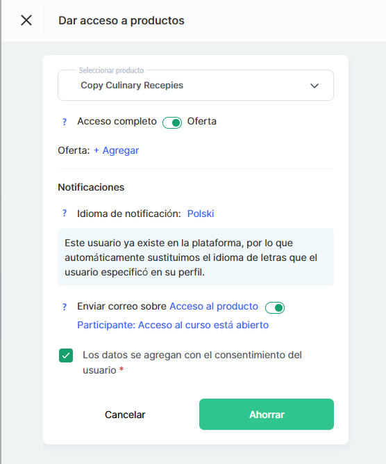 Haz clic en el botón +Producto, luego selecciona el producto requerido (curso, maratón o grupo cerrado).