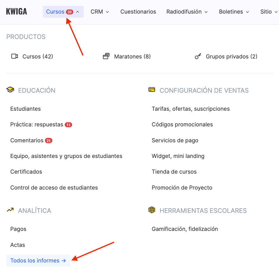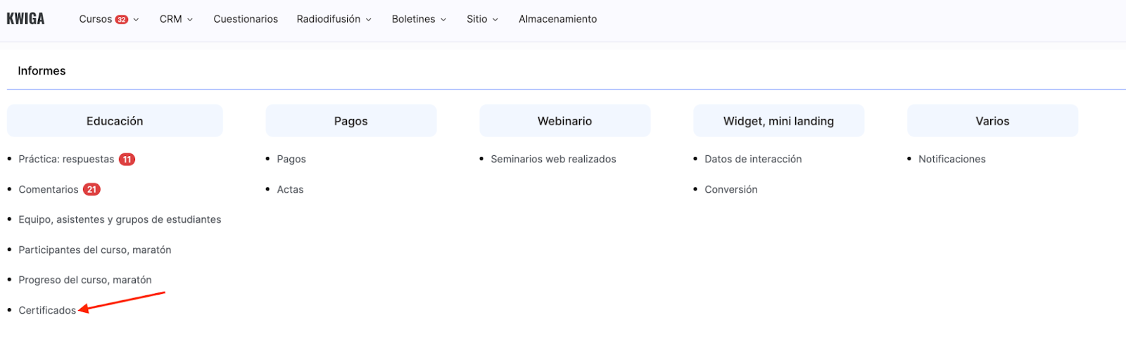 Para abrir el informe de certificados, ve al menú Cursos → Todos los informes