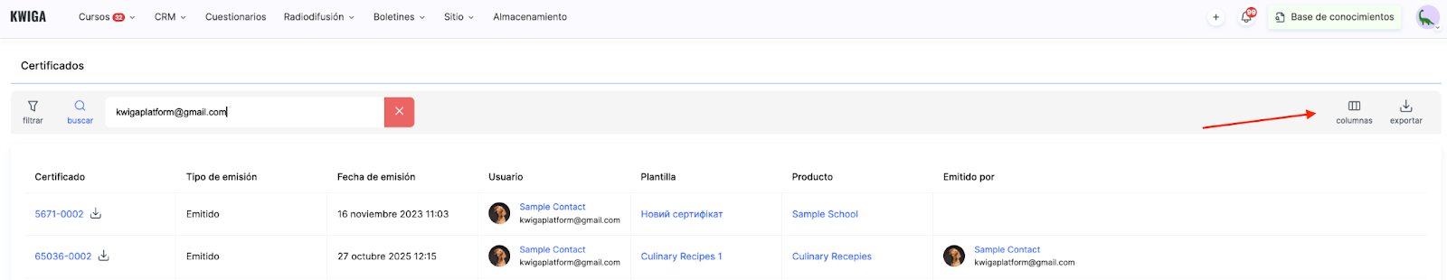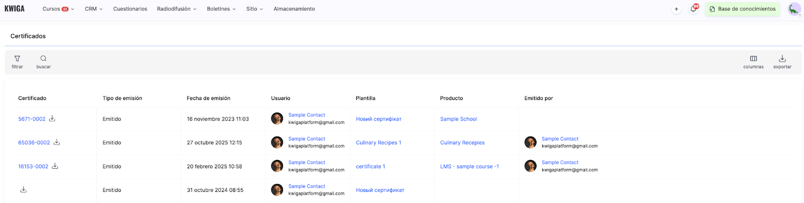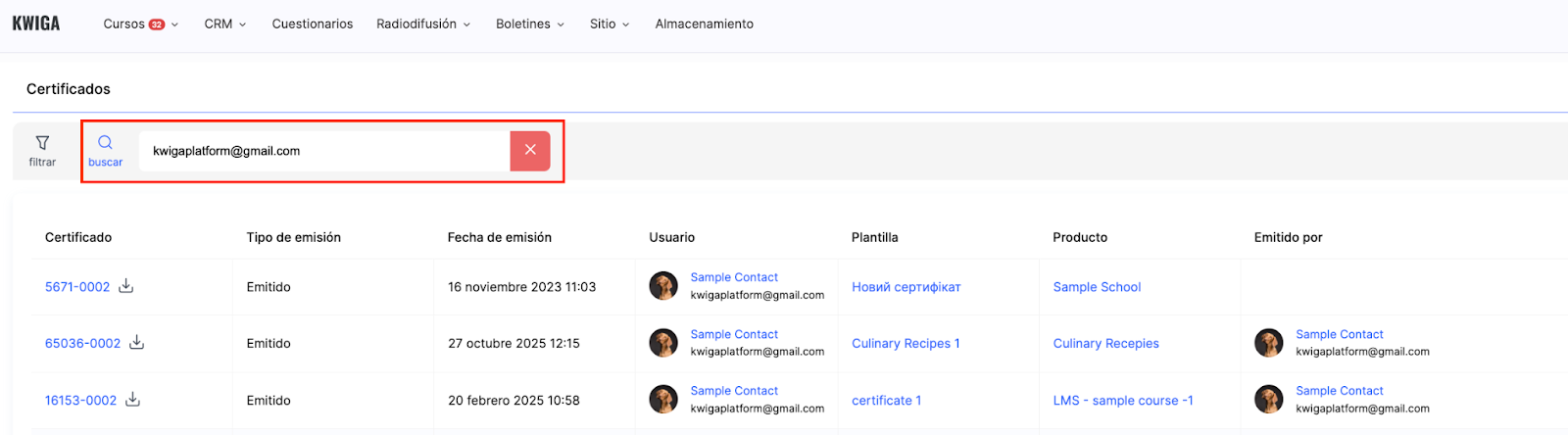 Solo tienes que introducir el nombre del estudiante o su dirección de correo electrónico en el campo de búsqueda, y el sistema filtrará los resultados, mostrando todos los certificados que ha recibido ese usuario. Esto resulta práctico para comprobar el historial de certificación de un estudiante específico o para preparar informes sobre sus logros.