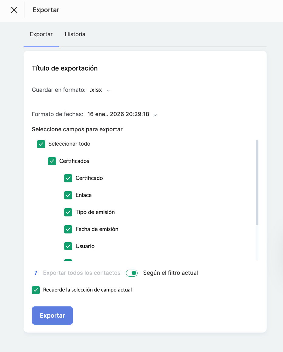 Exportar — posibilidad de exportar los datos de los certificados a un archivo externo para su posterior procesamiento o archivado.