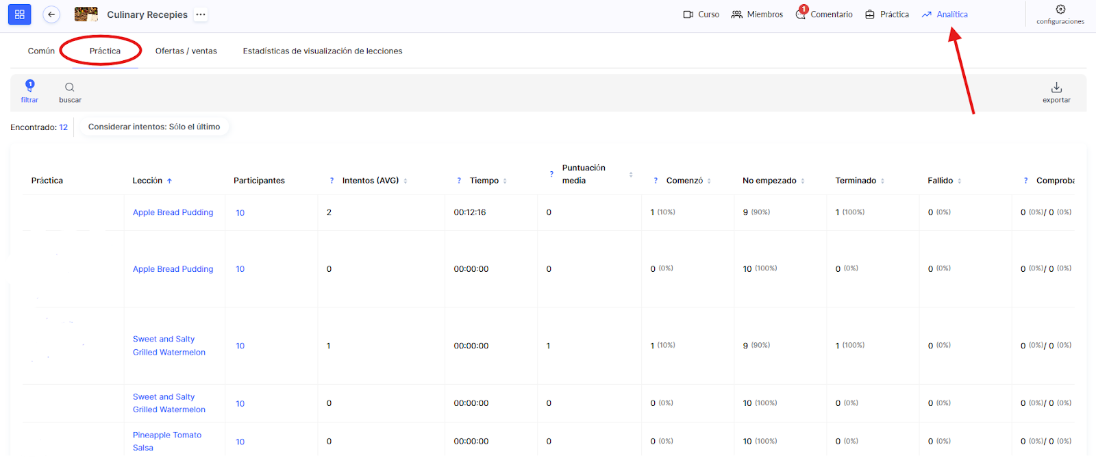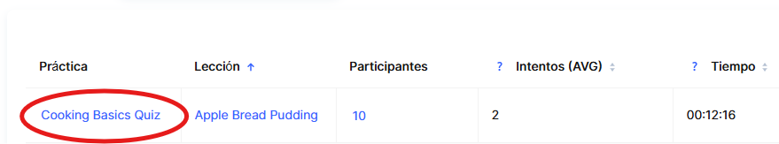La pestaña Práctica en la sección de analíticas del curso ofrece una herramienta práctica para hacer seguimiento de las estadísticas sobre la finalización de tareas. El propósito de este informe es garantizar la transparencia del progreso de los participantes, analizar los resultados e identificar áreas de mejora.