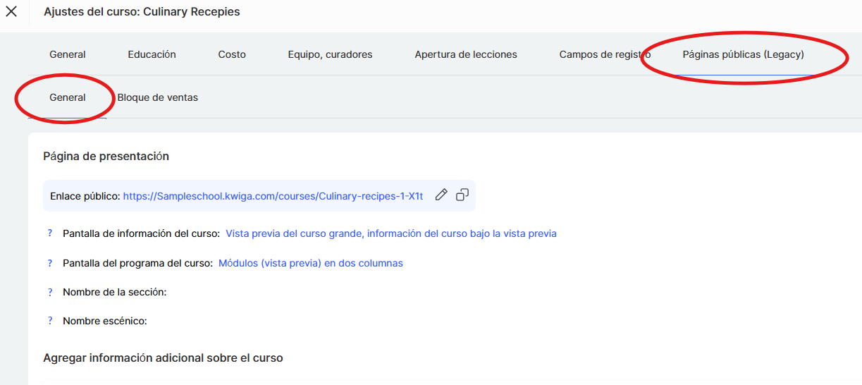 En la pestaña Páginas públicas, selecciona la sección General y desplázate hacia abajo hasta Página de lección / módulo.