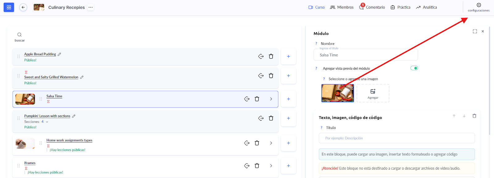 Configurar el bloque tomará solo unos minutos. Abre el curso deseado y ve a Configuración.