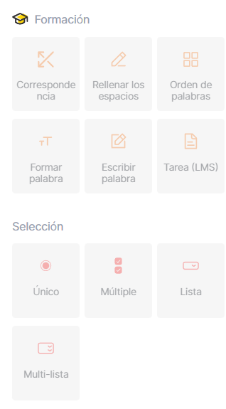 En el panel izquierdo encontrarás todos los tipos de preguntas disponibles, organizados en categorías para facilitar su uso.