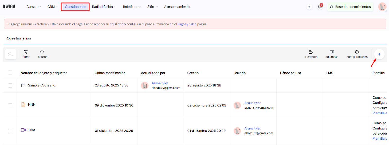 Ve a la sección Cuestionarios y crea una nueva tarea. Puedes leer sobre los diferentes tipos de tareas disponibles en Kwiga en el artículo Cuestionarios, prácticas: tipos de preguntas.