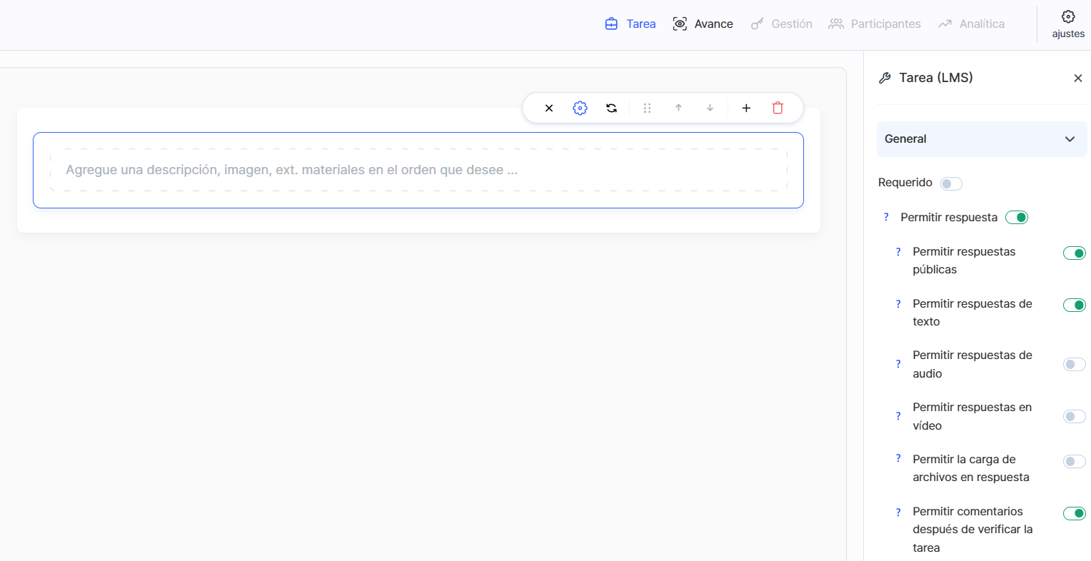 Recomendación: Con el tipo Tarea (LMS) no puedes añadir más preguntas. Úsalo cuando esperes una respuesta detallada o cuando el estudiante deba leer y responder los comentarios del tutor después de la revisión.