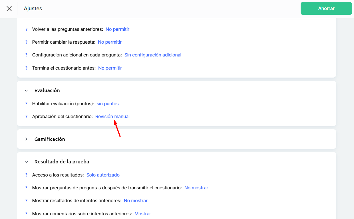 Para las tareas que requieren revisión manual, debes activar la opción Aprobación — por tutor en la configuración del cuestionario.