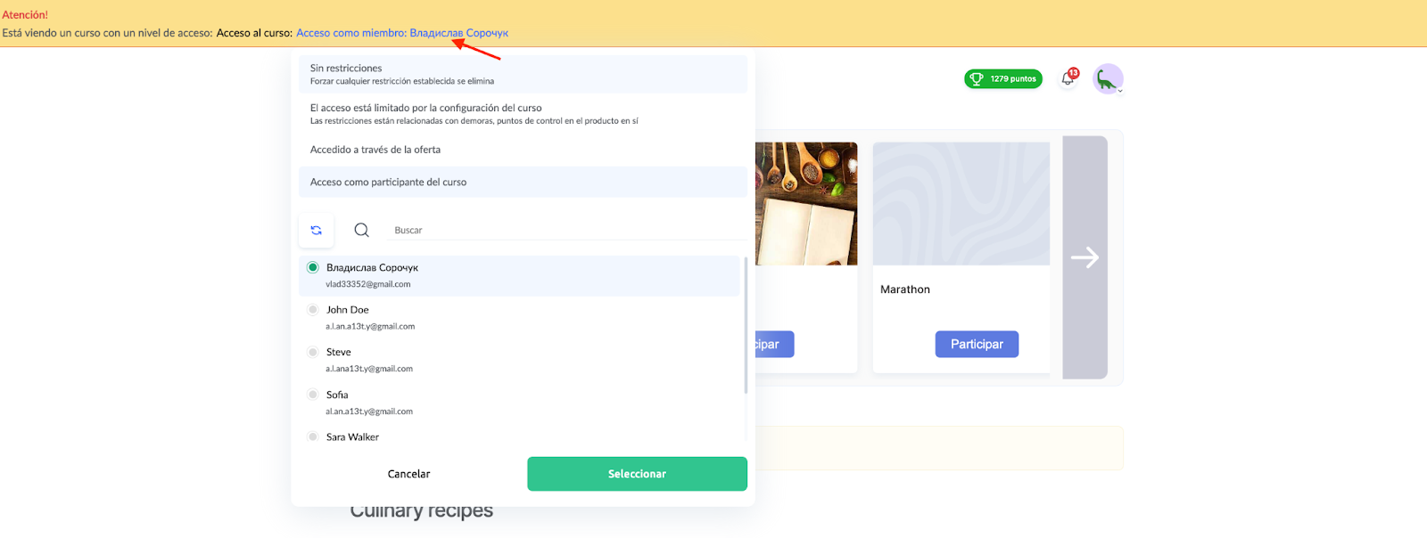 El curso se muestra tal como lo ven los usuarios que han obtenido acceso a través de una oferta específica. Este modo permite verificar que todas las restricciones y condiciones estén correctamente configuradas. Úsalo para revisar la configuración del plan de precios o los flujos específicos y asegurarte de que todo funcione según lo previsto.