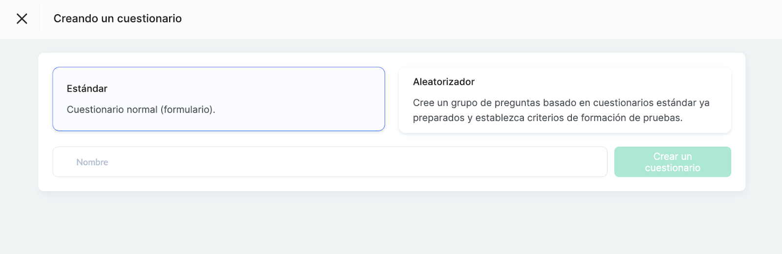 Elige Cuestionario estándar y escribe el nombre en el campo correspondiente.