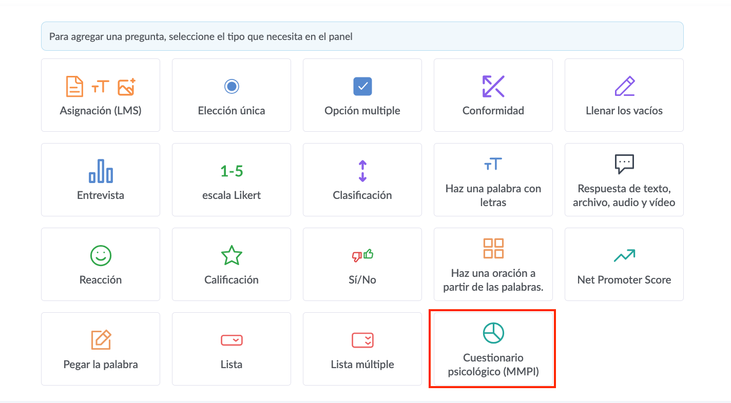Haz clic en Crear cuestionario y selecciona el tipo de pregunta MMPI.