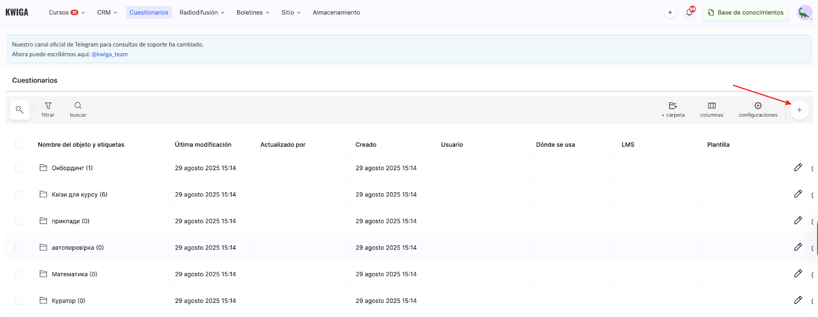 Ve al menú Cuestionarios en tu cuenta de Kwiga. Haz clic en el botón + para crear un nuevo cuestionario.