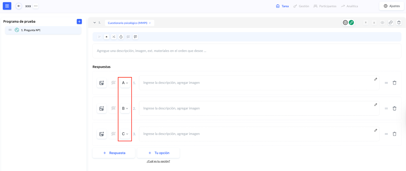 Añade las opciones de respuesta y asígnales letras desde el menú desplegable. La plataforma sugiere por defecto A, B y C, pero puedes cambiarlas según la lógica de tu prueba.