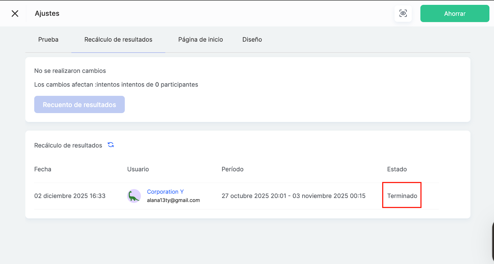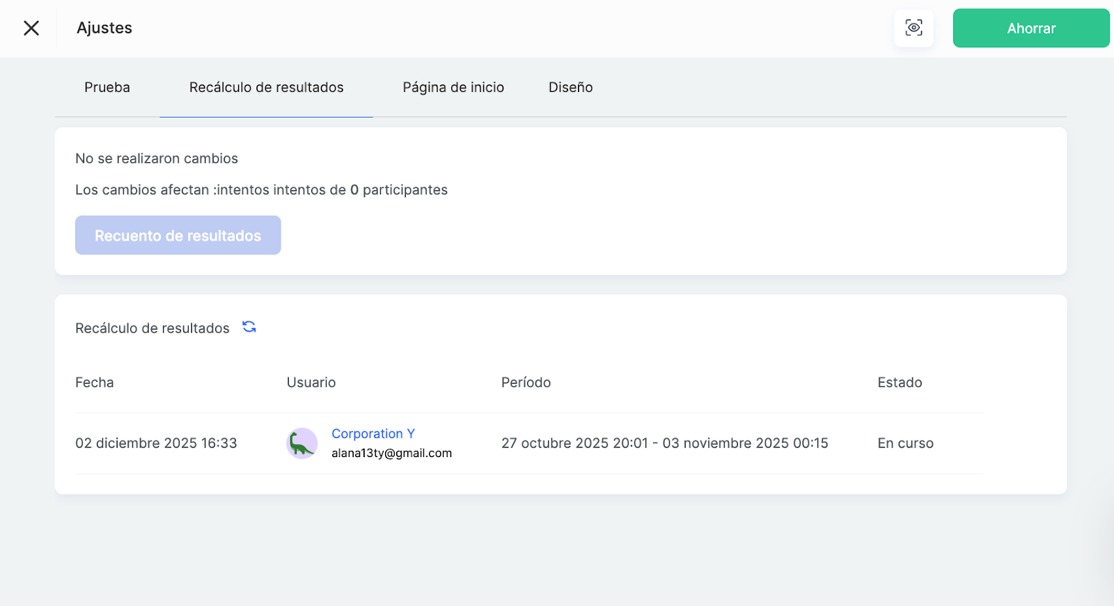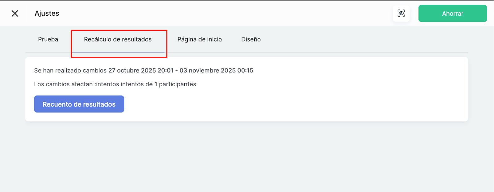 Al hacer clic en el botón Recalcular Resultados, el sistema actualiza en segundo plano todos los intentos completados hasta el momento de la última edición.