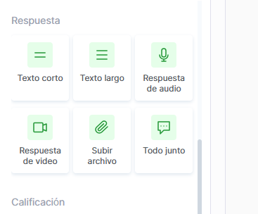 Ambas opciones permiten añadir preguntas abiertas, carga de archivos, respuestas de audio y video, así como configurar la calificación y la revisión.