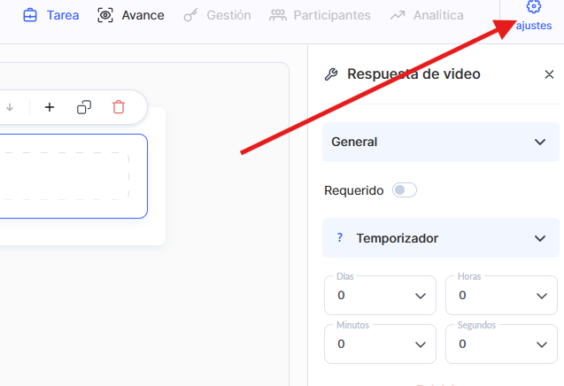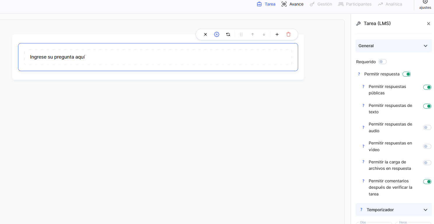 Para controlar el tiempo, puedes habilitar un temporizador. Este puede funcionar como un cronómetro o limitar el tiempo para completar la tarea. Los participantes verán cuánto tiempo queda y, cuando se acabe, el cuestionario se cerrará automáticamente y se marcará como completado.