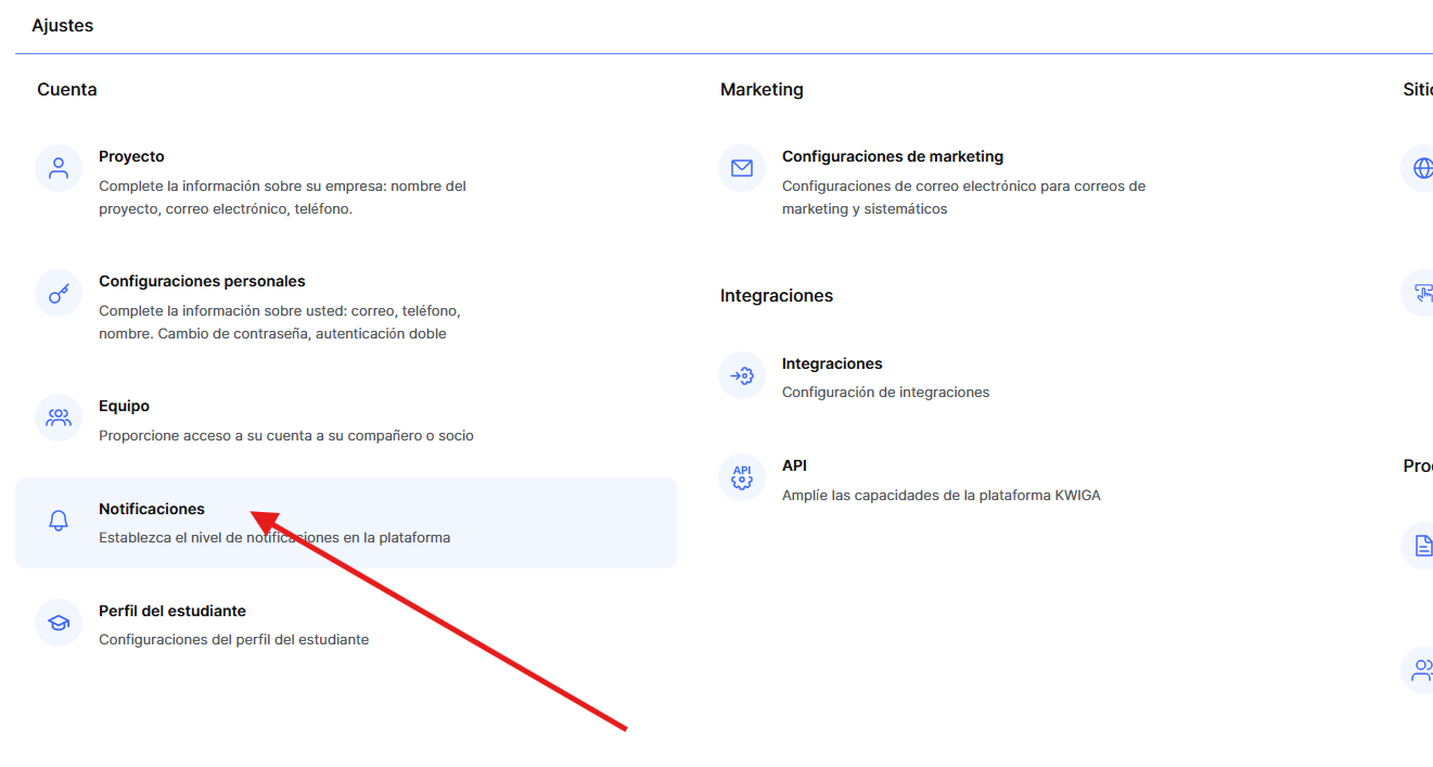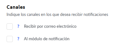 Aquí puedes habilitar la recepción de notificaciones mediante la campana de la plataforma o por correo electrónico, y debajo elegir qué notificaciones específicas deseas recibir.