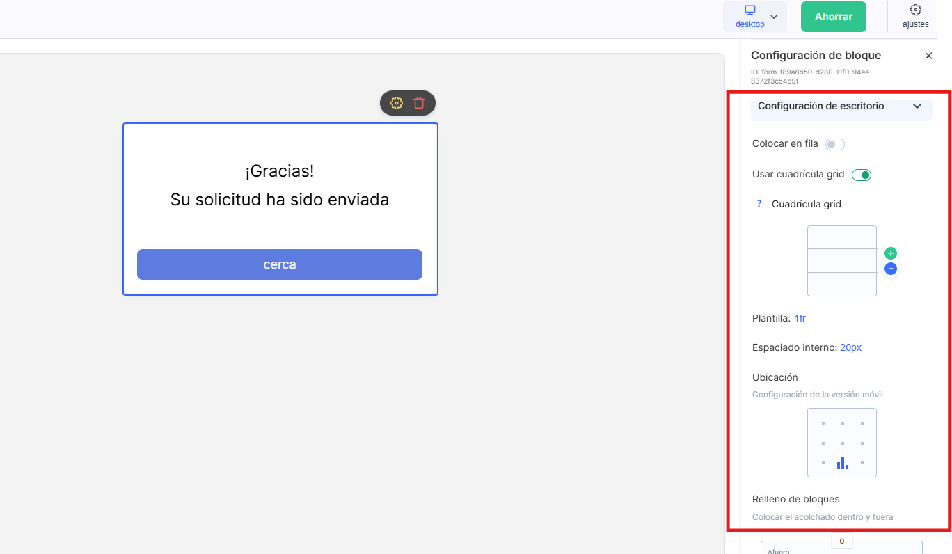 Este bloque te permite adaptar la apariencia del formulario para pantallas grandes, garantizando una alineación correcta e integración fluida en tu página. Las opciones disponibles incluyen: