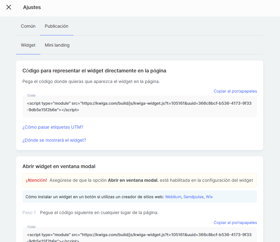 En la pestaña Publicación, puedes copiar el código del widget para incrustarlo directamente en tu página.