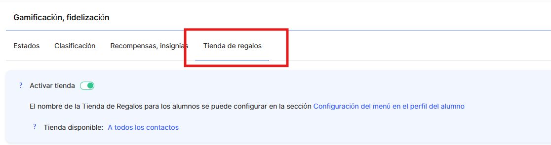 La información detallada sobre la configuración de la tienda de regalos se describe en un artículo independiente.