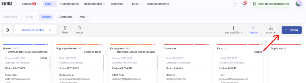 Todos los pedidos creados también pueden visualizarse y gestionarse cómodamente en un menú aparte: CRM → Pedidos, donde está disponible una lista completa con filtros y búsqueda. Si tienes múltiples productos o direcciones, puedes usar varios embudos — para diferentes tipos de clientes o proyectos. Más detalles sobre la apariencia de la sección de pedidos se pueden encontrar en el enlace.