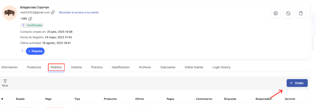 Sin embargo, un pedido también puede crearse manualmente. Esto resulta conveniente si deseas otorgar acceso sin una compra, aplicar configuraciones personalizadas o trabajar con el cliente de forma manual.