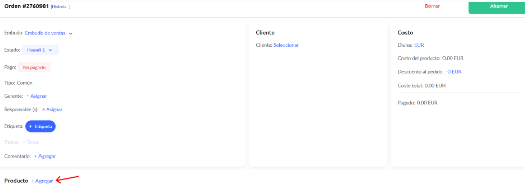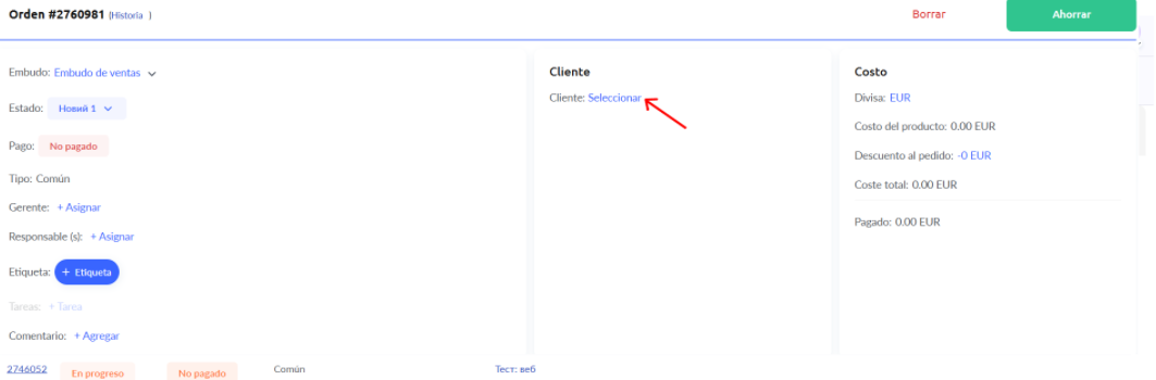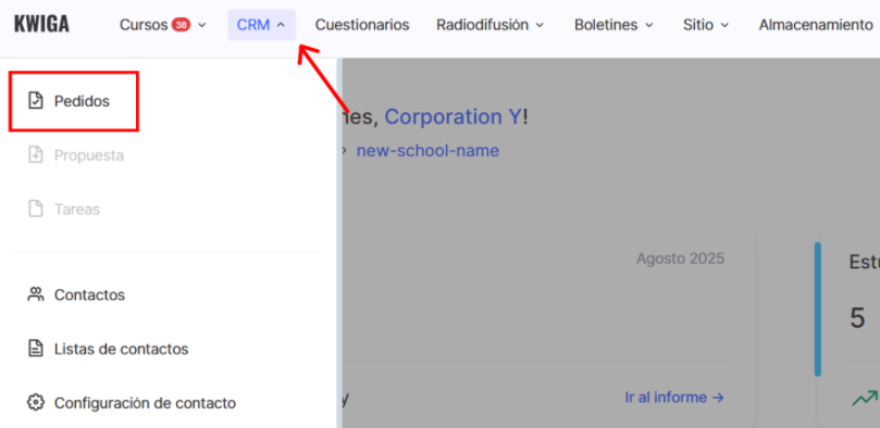 Para abrir un pedido para edición, ve a CRM → Pedidos.