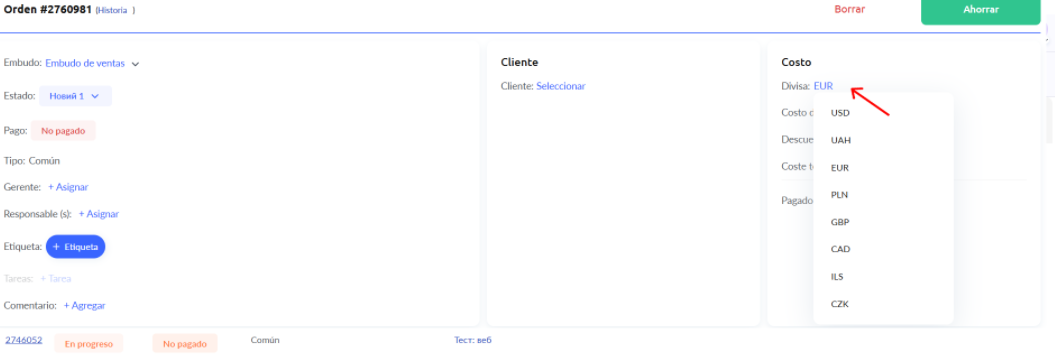 Costo — ingresa el monto exacto. La moneda se extrae automáticamente de la configuración del pedido.
