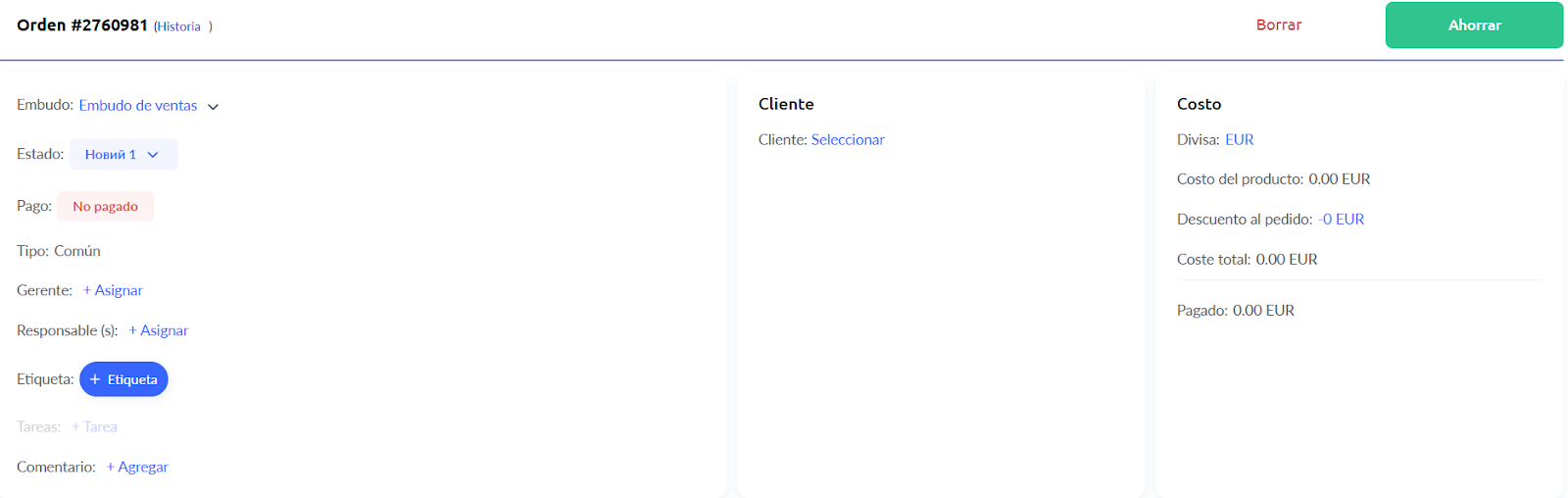 Para editar un pedido, haz clic en el número del pedido o en el ícono que aparece junto a él. Se abrirá un formulario completo del pedido, donde podrás modificar la mayoría de los parámetros.