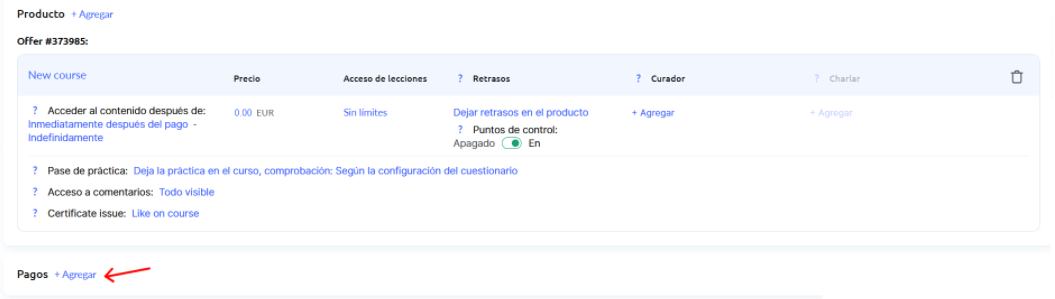 En la sección Producto, haz clic en + Añadir para seleccionar un curso u otro producto.