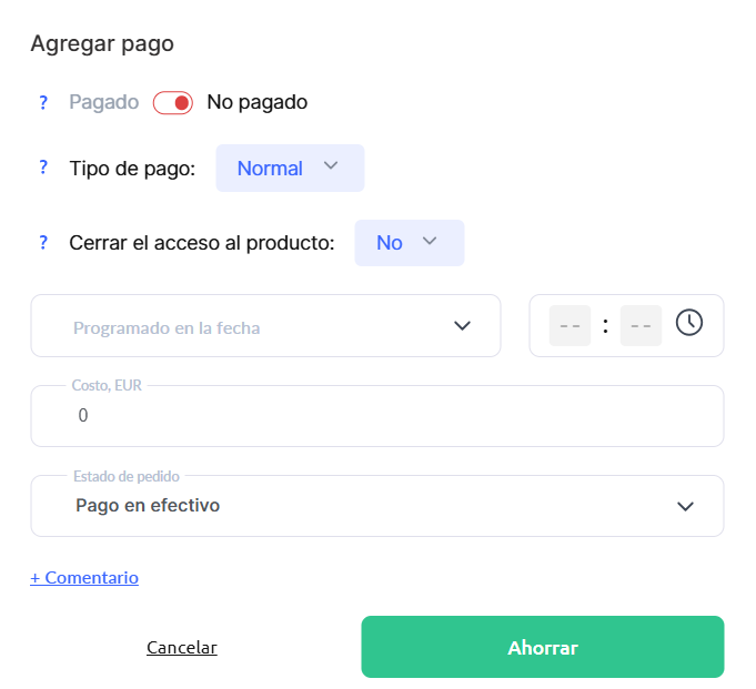 Por ejemplo, si un pago se realizó fuera de la plataforma, puedes marcarlo manualmente como Pagado y añadir un comentario. O, si los cambios en las configuraciones de acceso implican un pago adicional, puedes crear un nuevo pago no pagado.